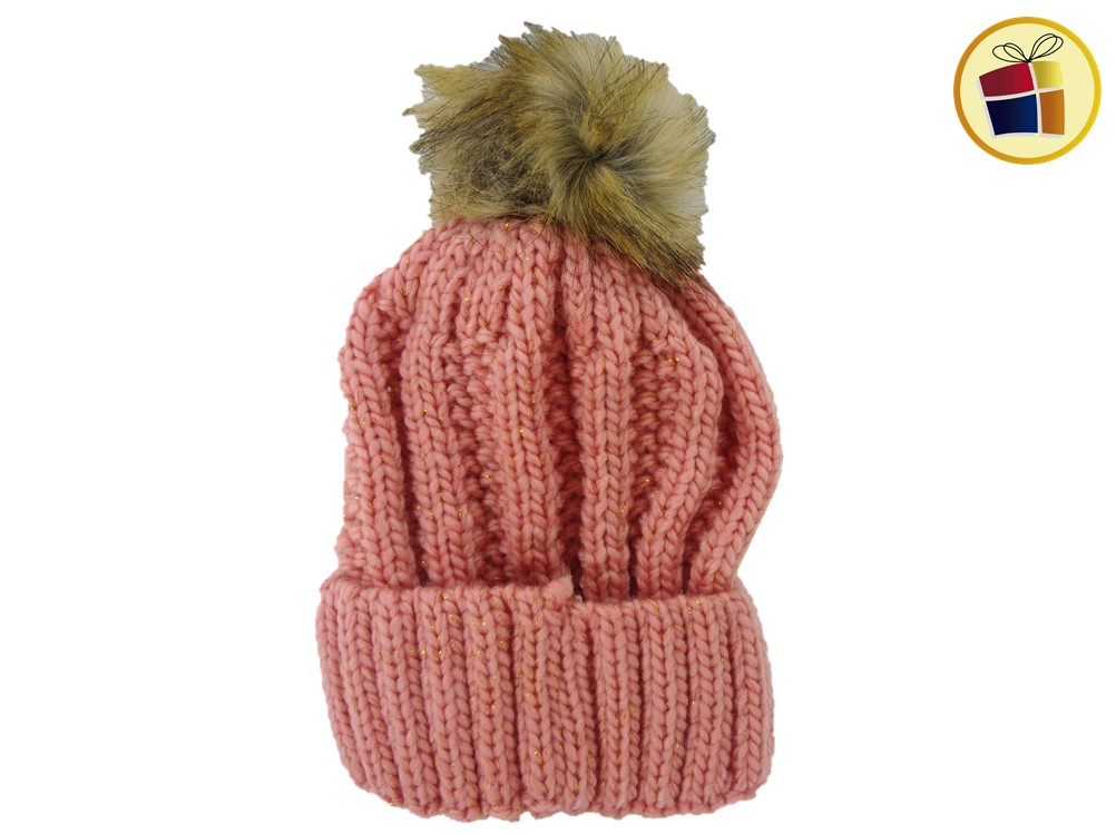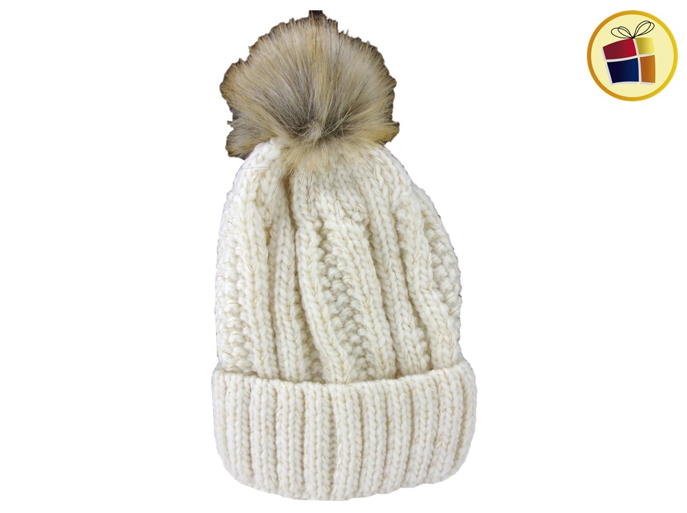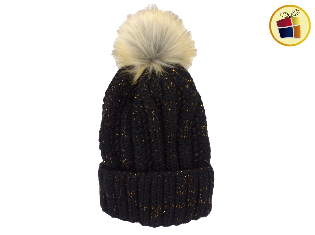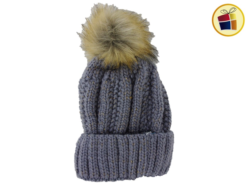 Gorro para dama de lana con brillo y pompon de piel.