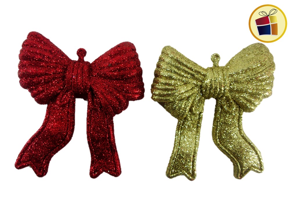 Adorno moño navideño con brillo x2 de colores de 9cm cada uno en bolsa.