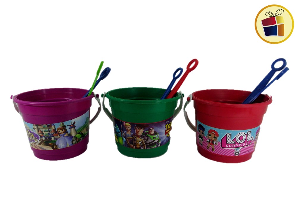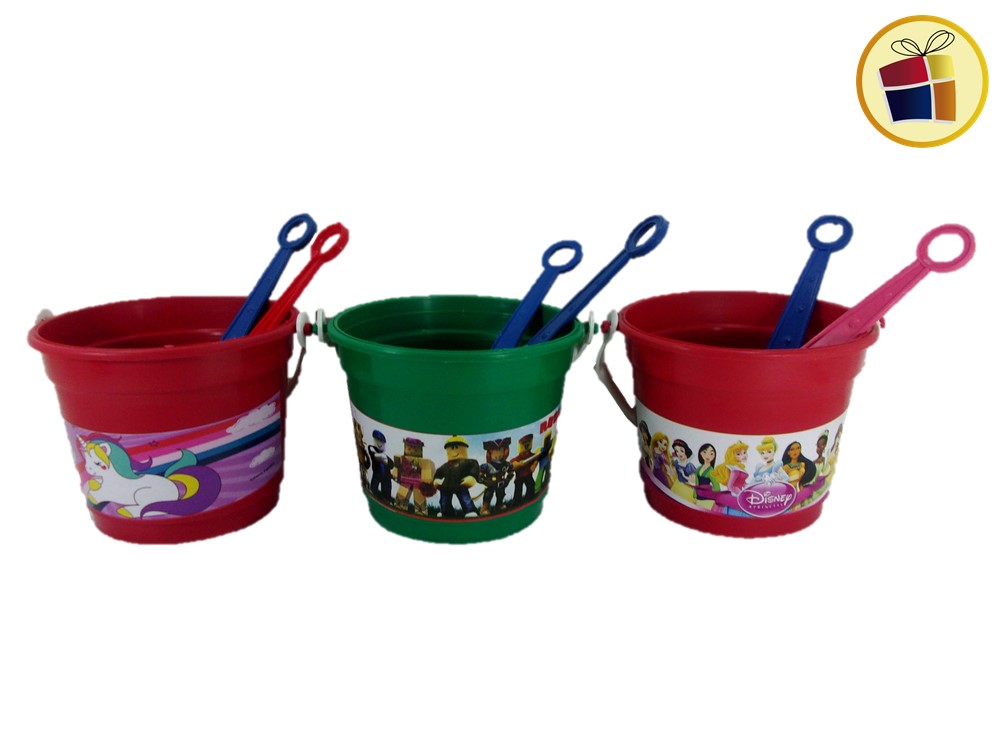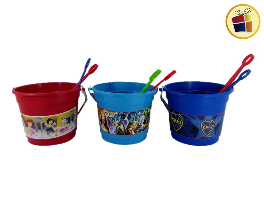 Balde de playa personaje con pala y rastrillo de color en bolsa