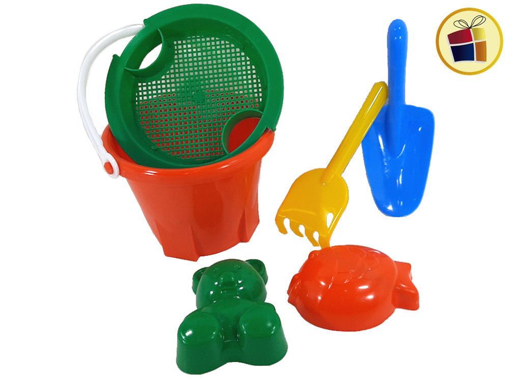 Balde Mediano de playa con accesorios de pala + rastrillo + molde variado en colores.