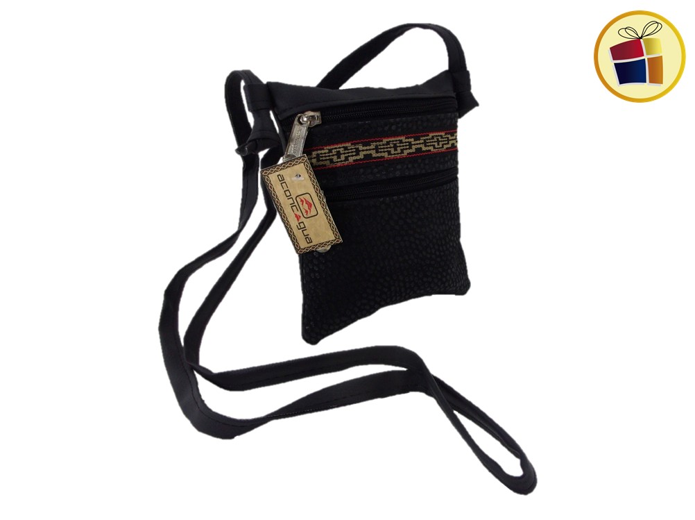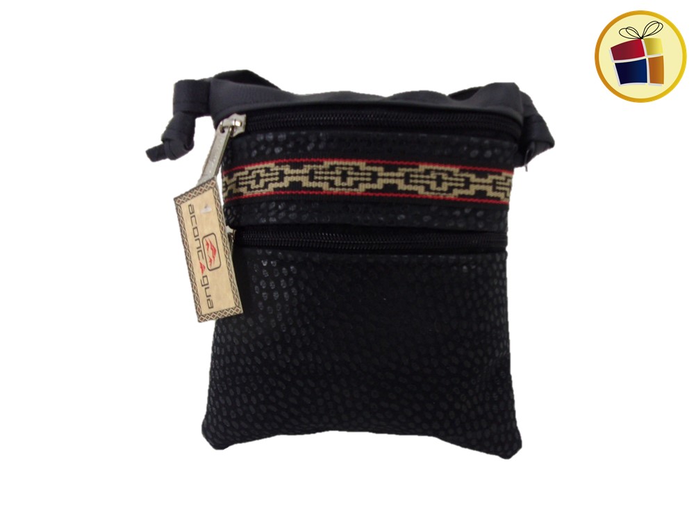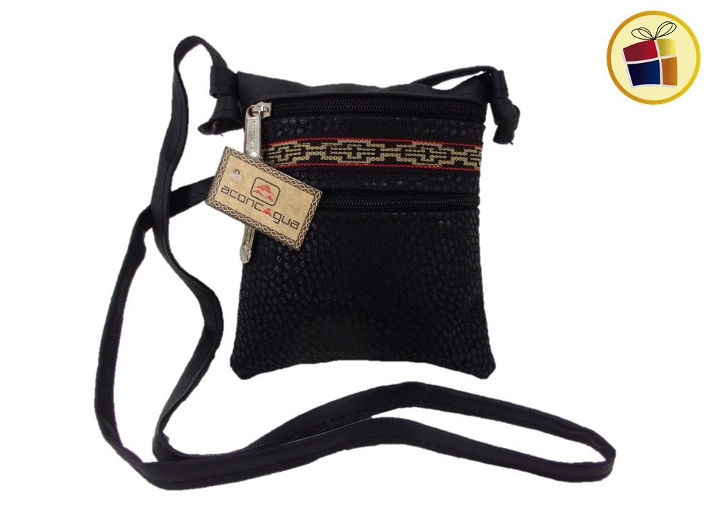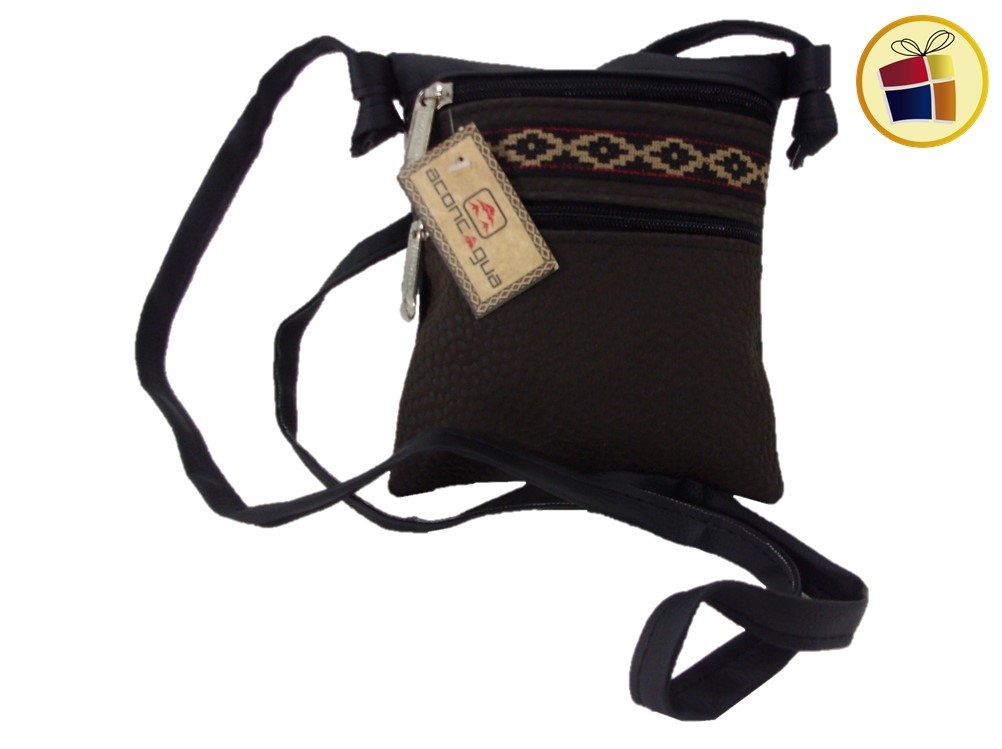 Bandolera chica de dos cierres con tela terciopelada, cuerina y cinta de guarda.