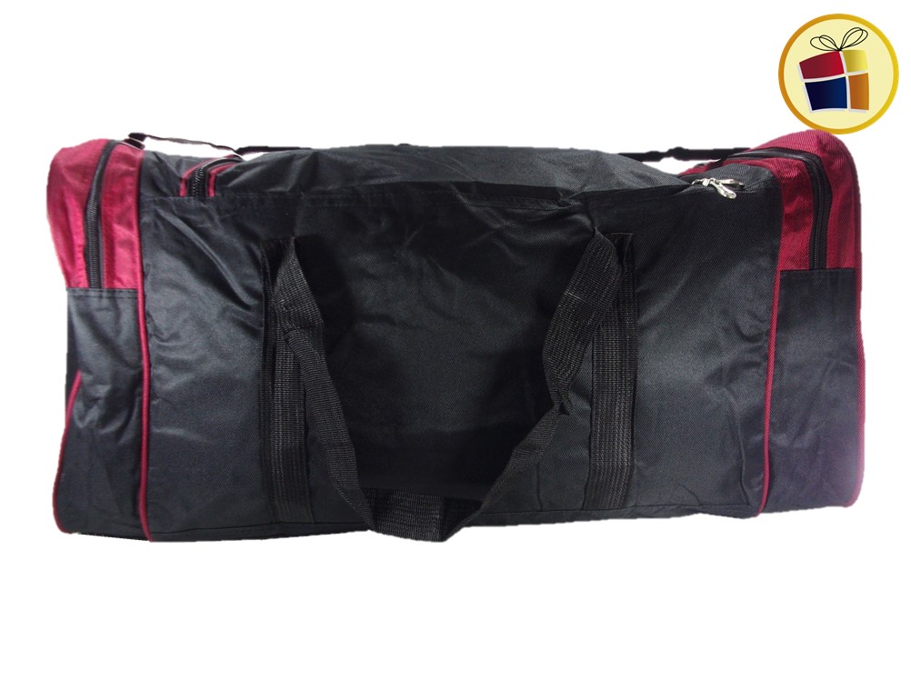 bolso de viaje grande con cinco bolsillo, con manija y correa, con la palabra SPORT bordada.