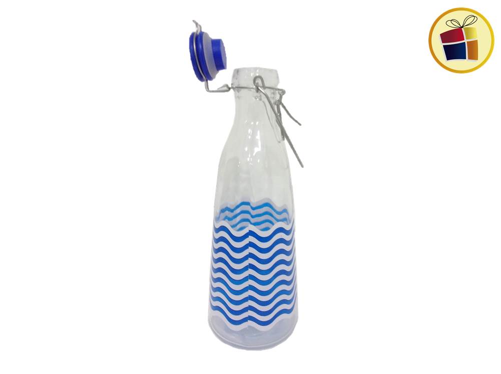 Botella de vidrio estampada contiene tapa a presión de plastico, con seguro y manija de metal.