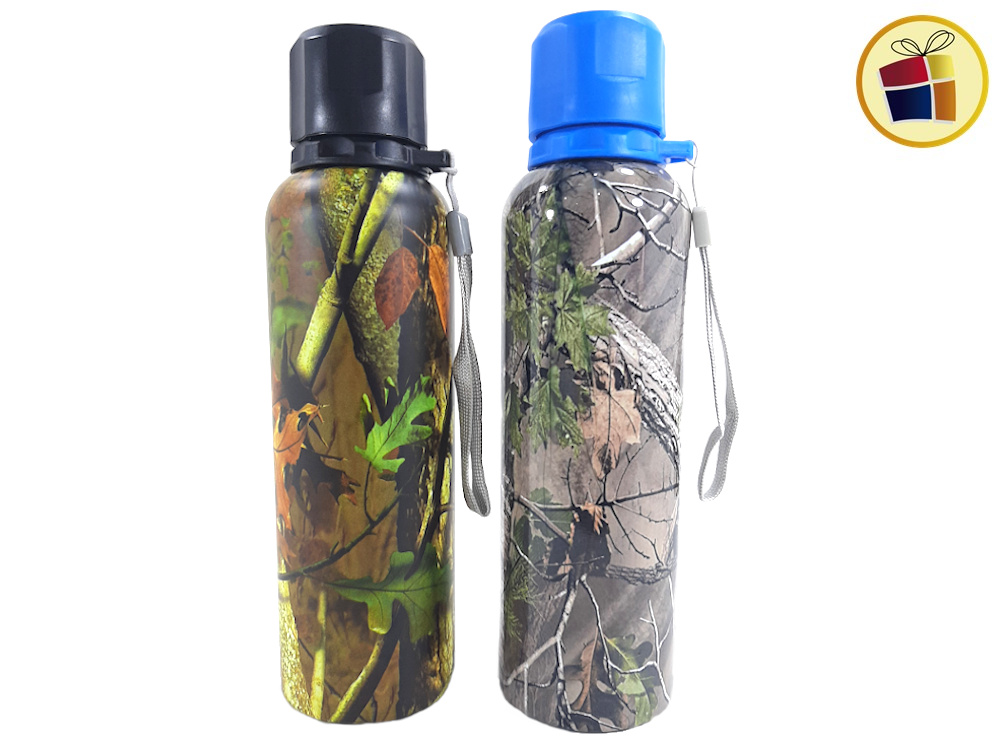 Botella deportiva de acero con tapa y cuerda.