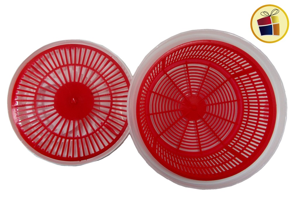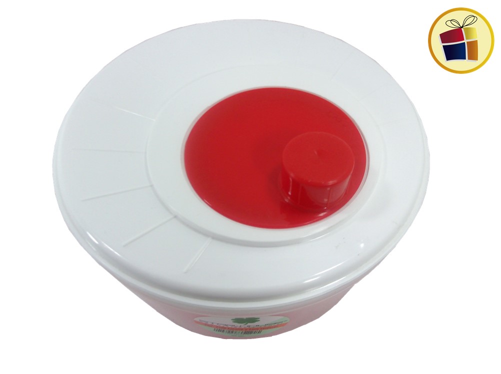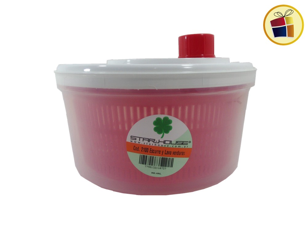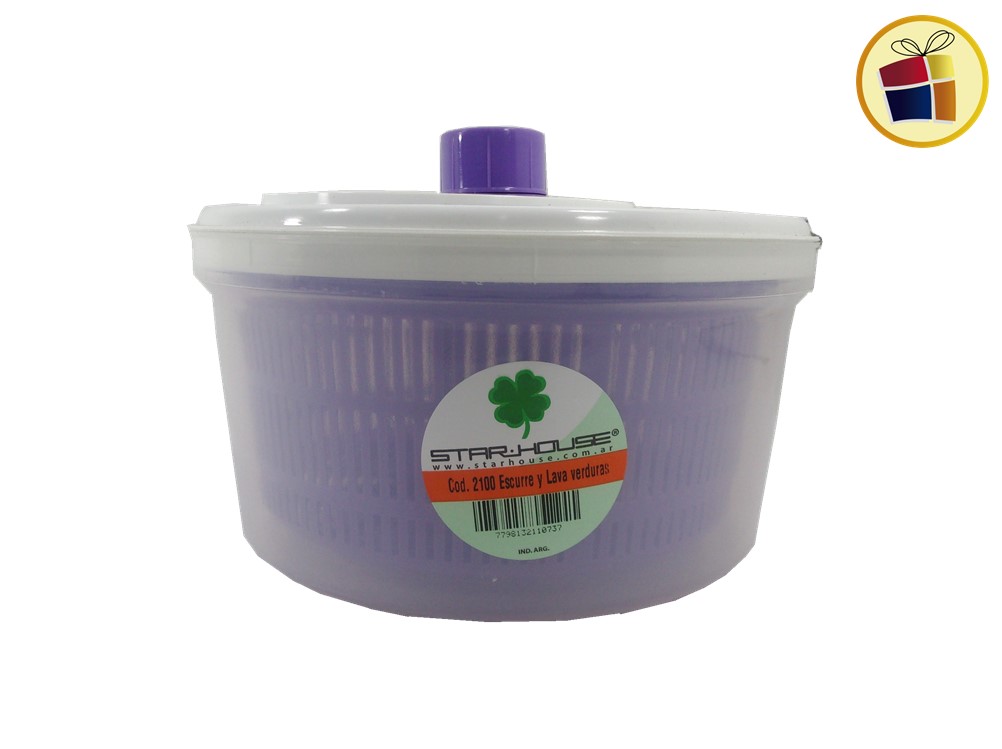 Escurre lavaverdura de plastico con tapa apresion, la parte de adentro de color, parte de afuera traslucido con tapa blanca.