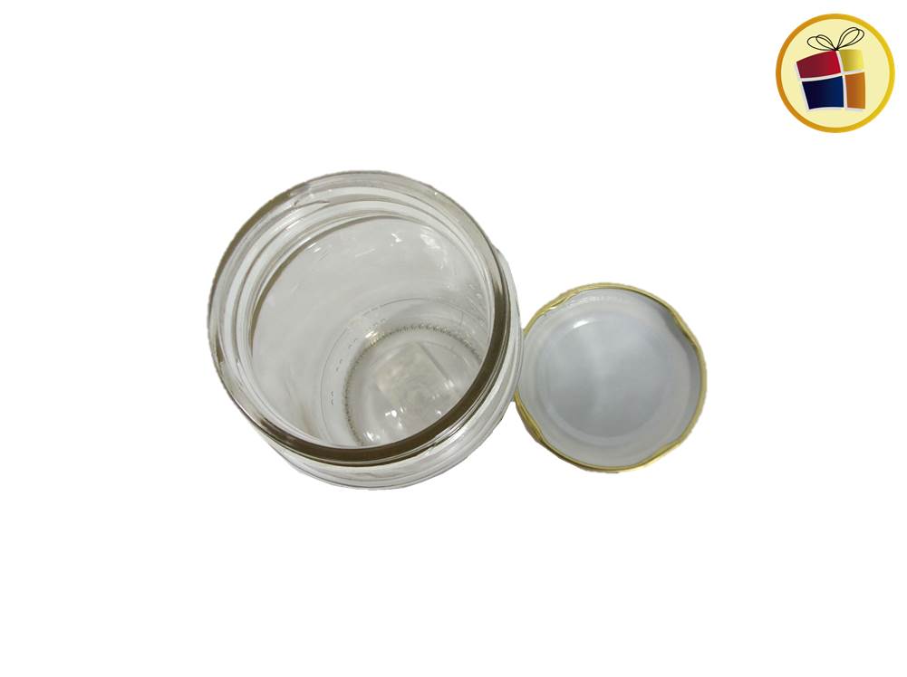 Frasco de vidrio con tapa a rosca de Acero dorado.
