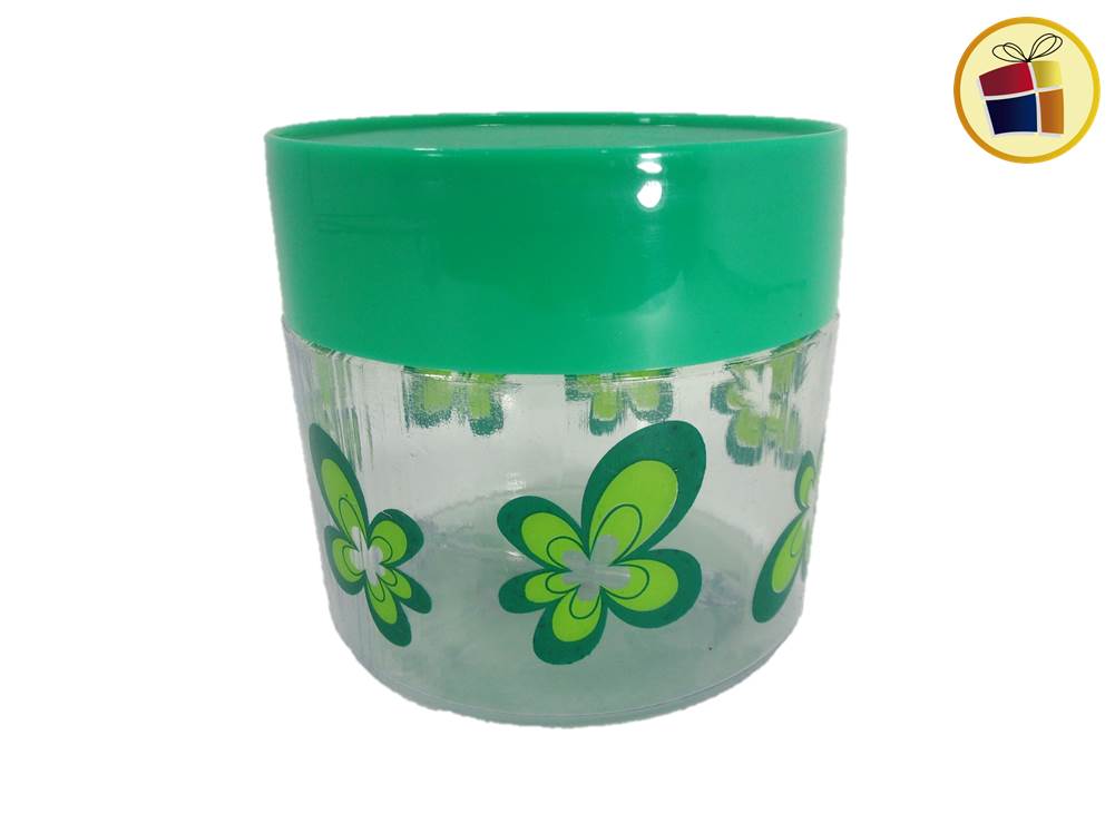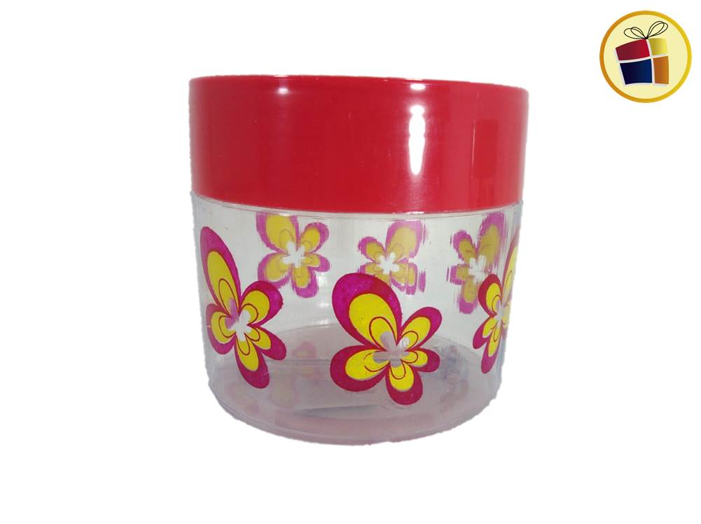 Frasco redondo de plastico con detalle decorado con tapa a rosca de color.