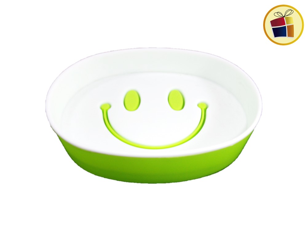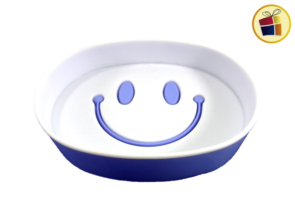 Jabonera de plastico oval con carita. con un diseño infantil con una figura de carirta en el fondo de el.