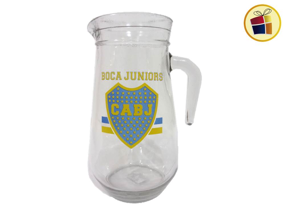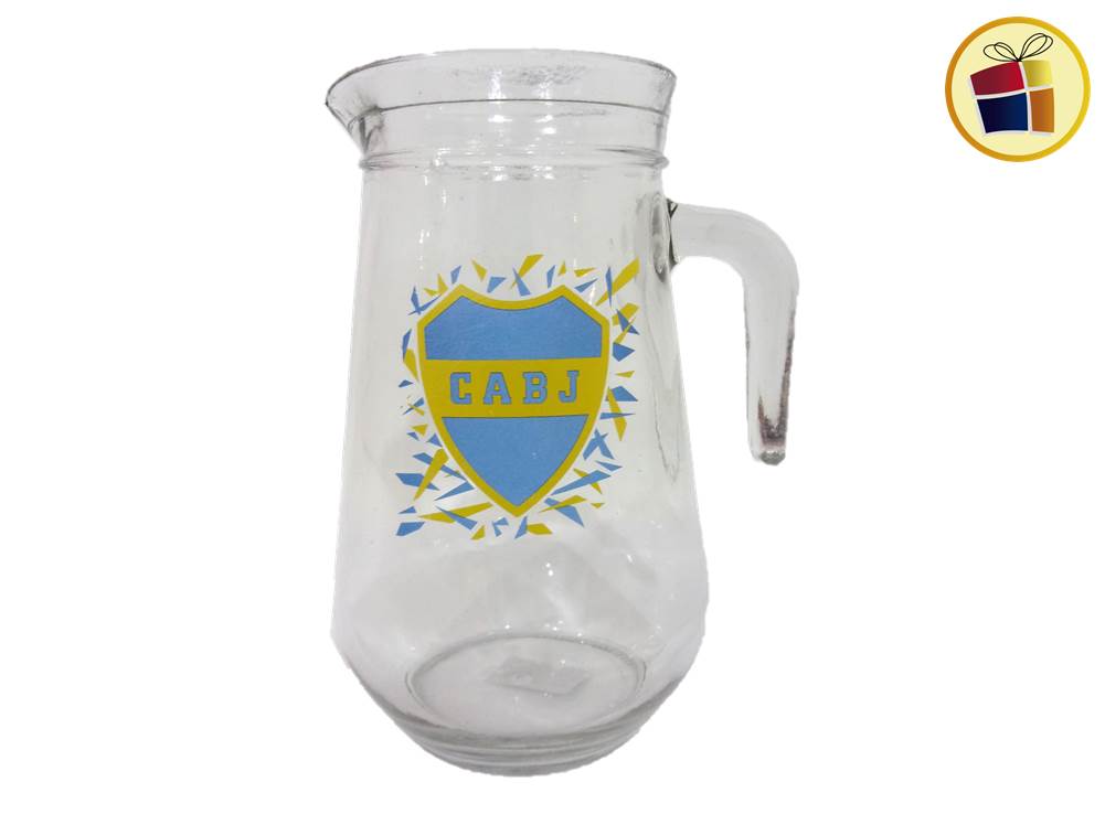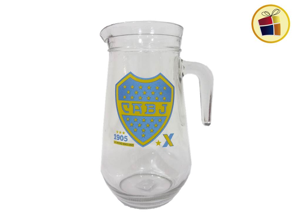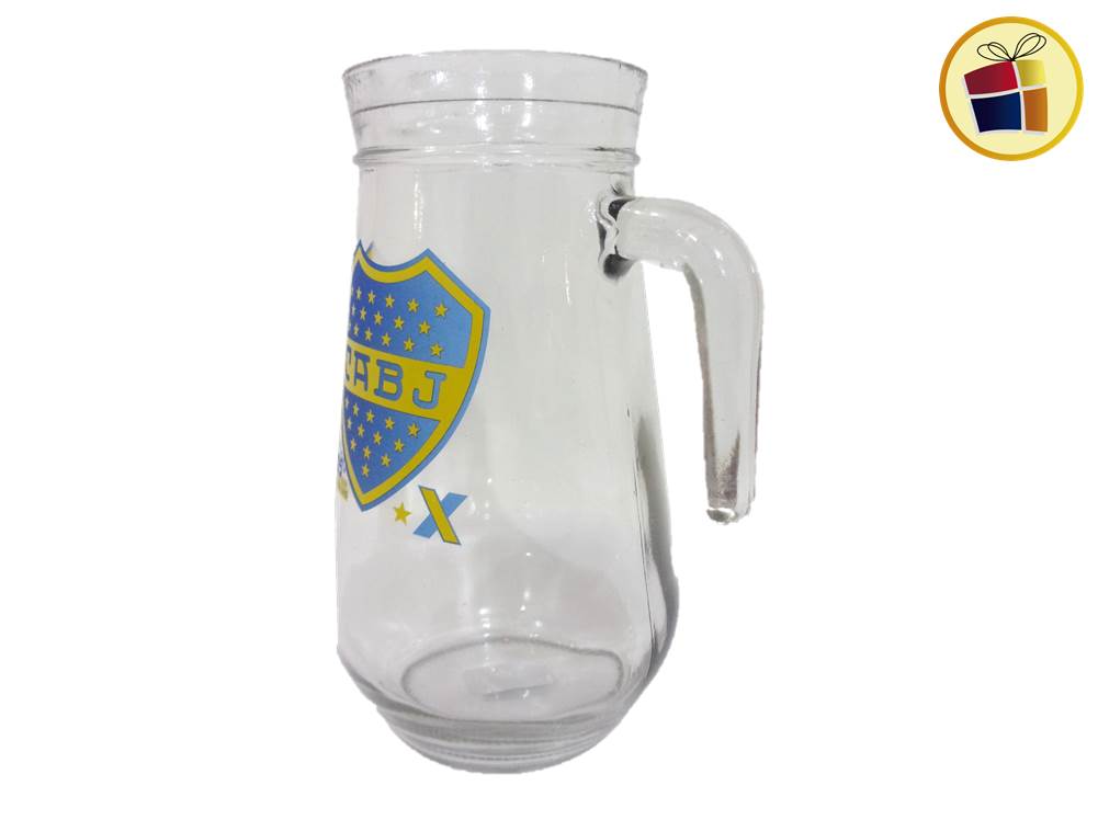 Jarra de vidrio con manija con vinilos de equipo de futbol.