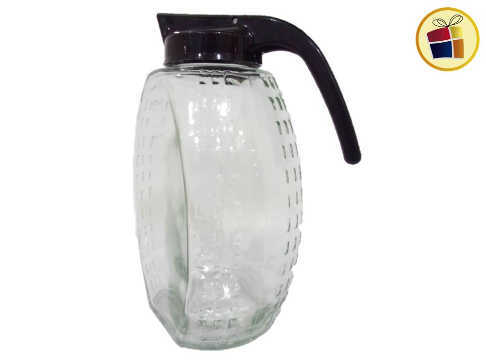 Jarra de vidrio labrado contiene tapa con manijas y seguro de plastico.