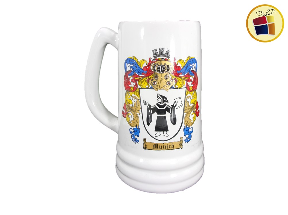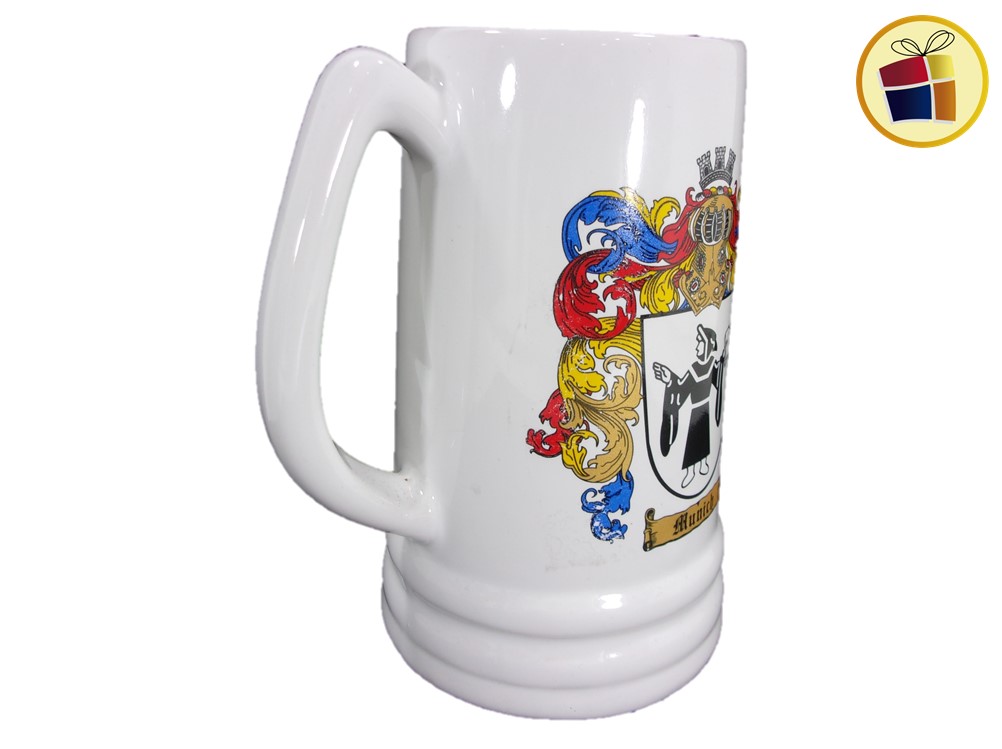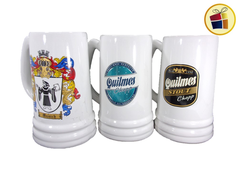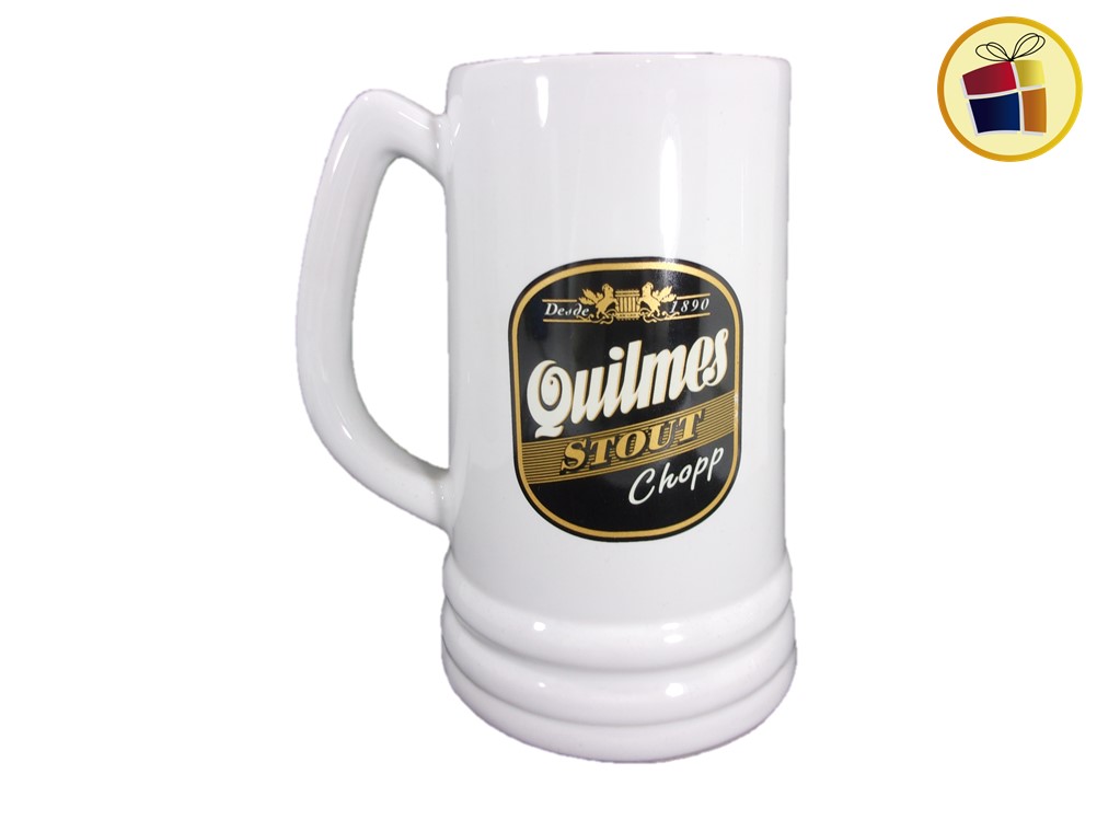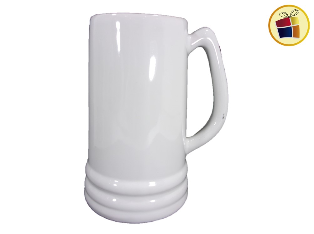 Jarro chopp cervecero de ceramica, alto con capacidad de un litro, color blanco con estampado con manija y anillado.