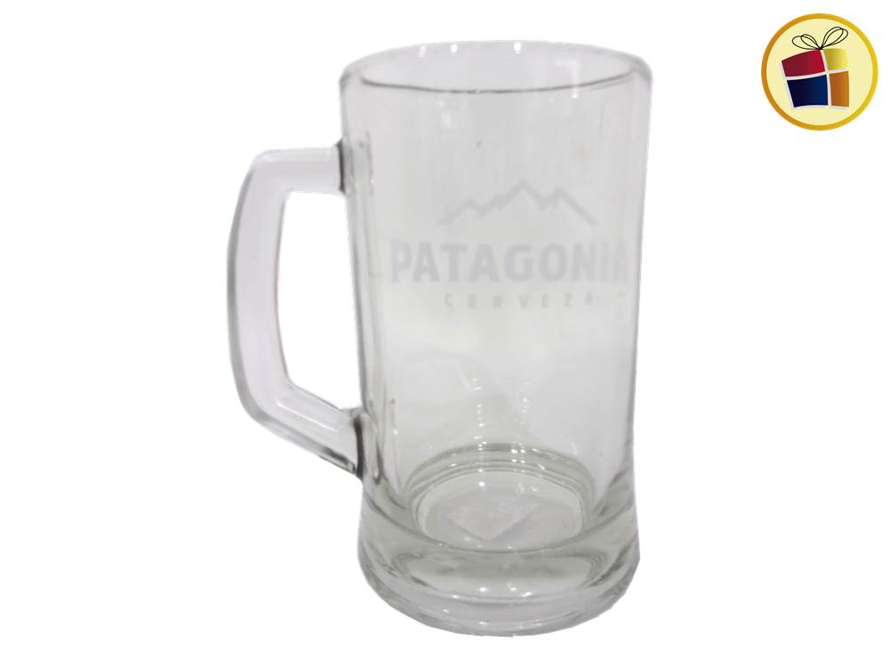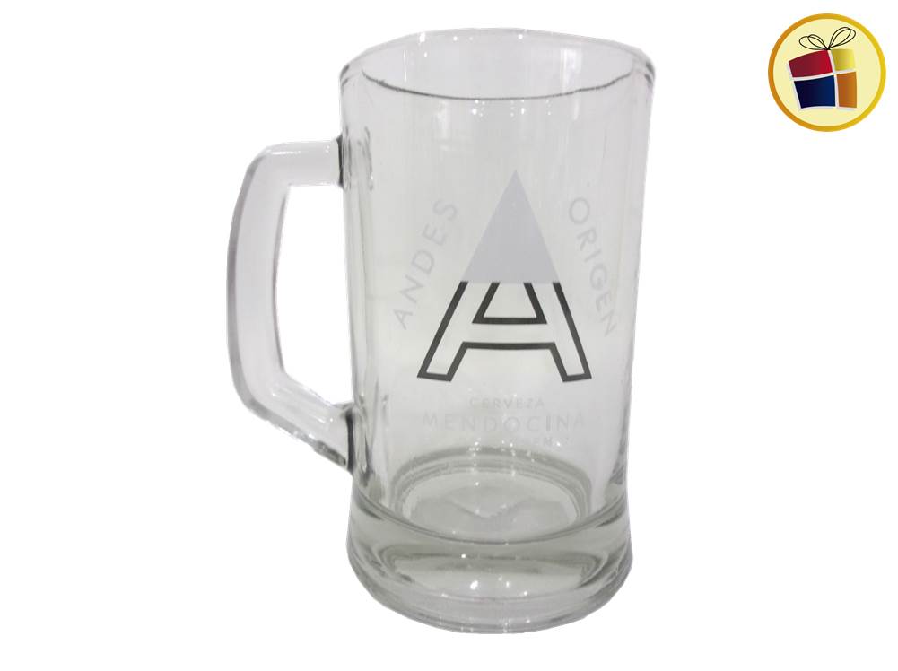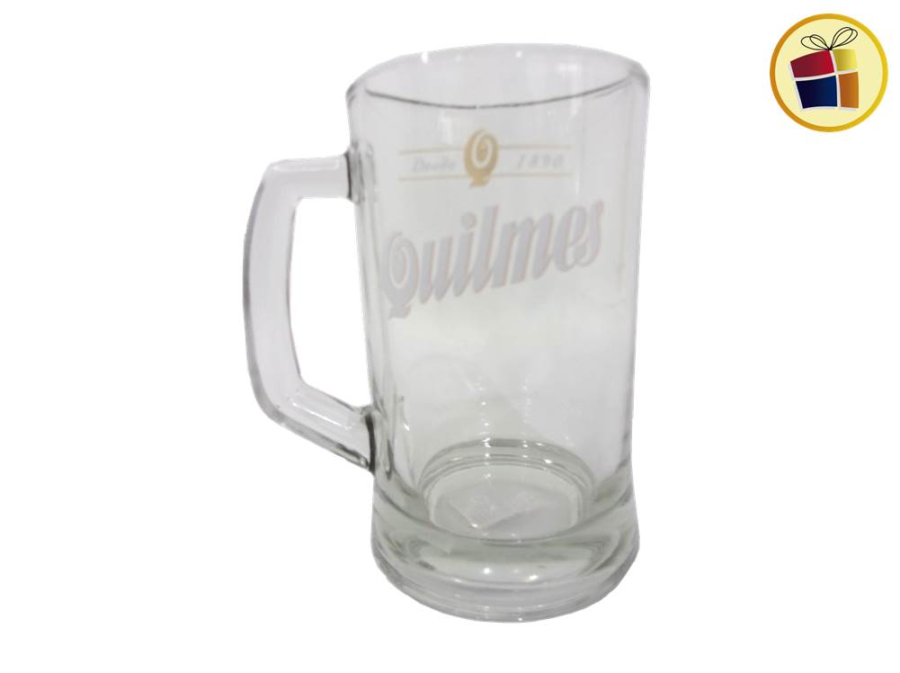 Jarro chopp de vidrio con manija y estampado de marcas.
