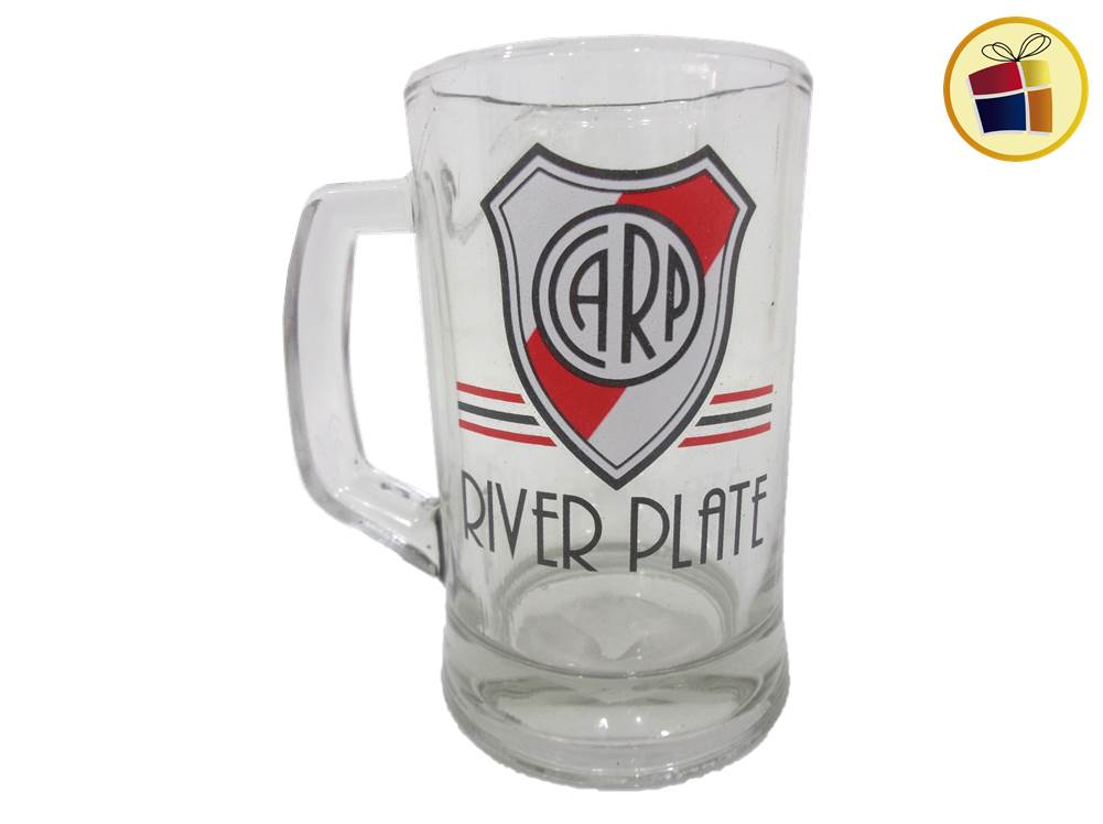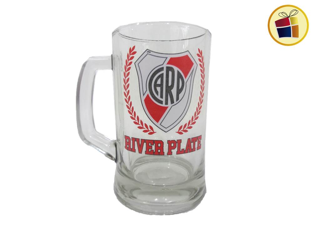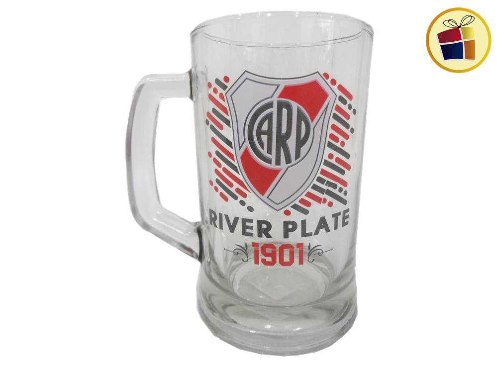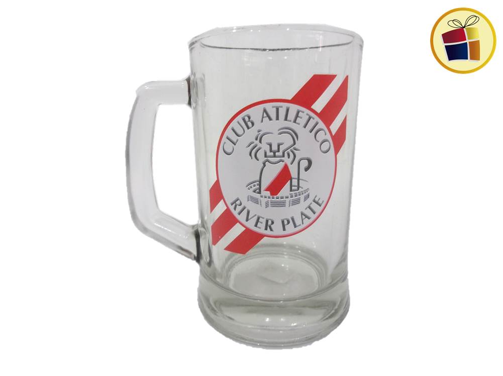 Jarro chopp de vidrio liso con manija y estampado logos, cuadros.