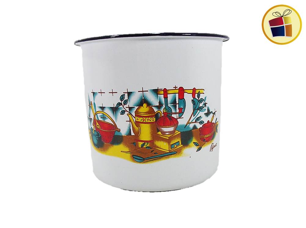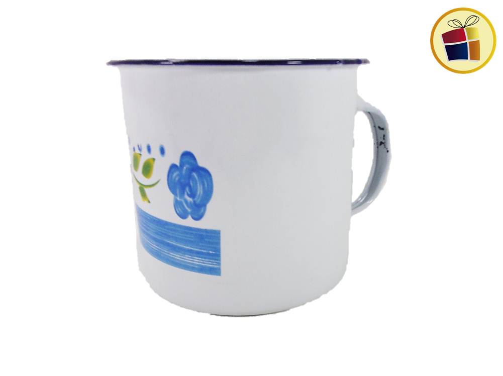 Jarro enlozado, color blanco con distintas figuras.