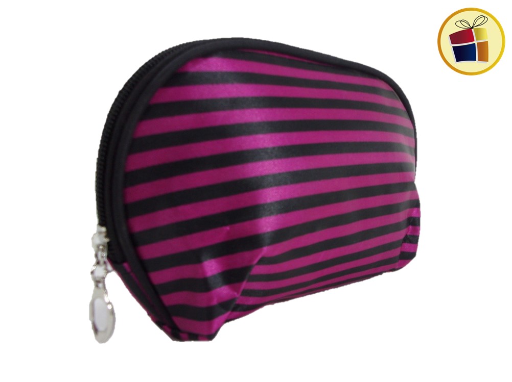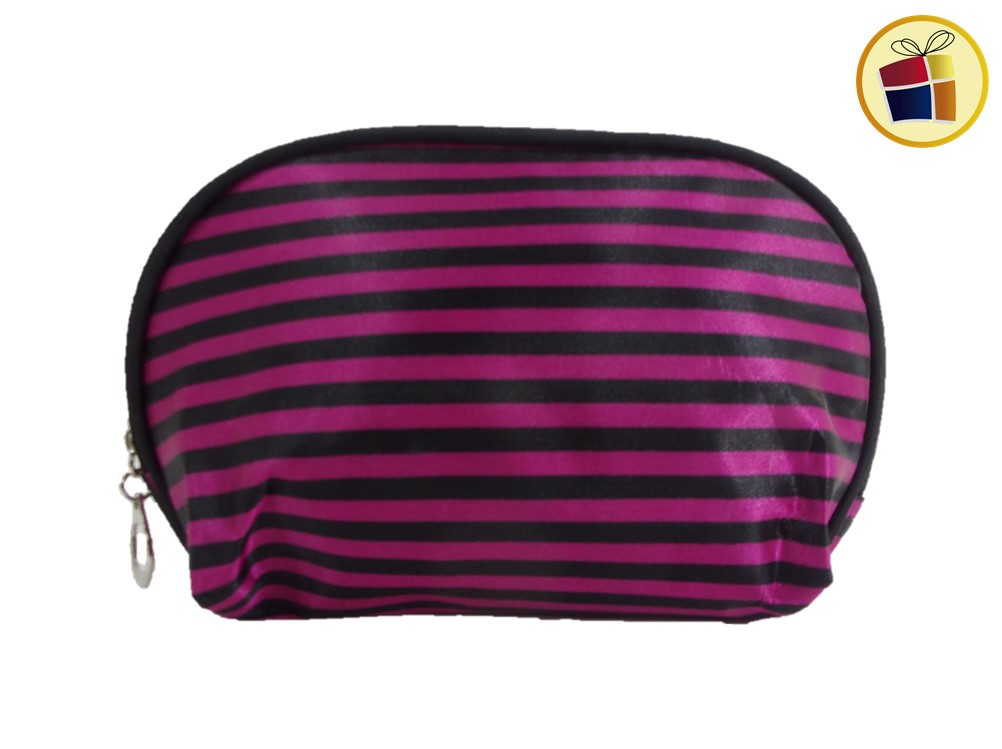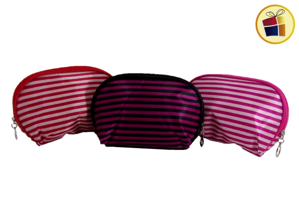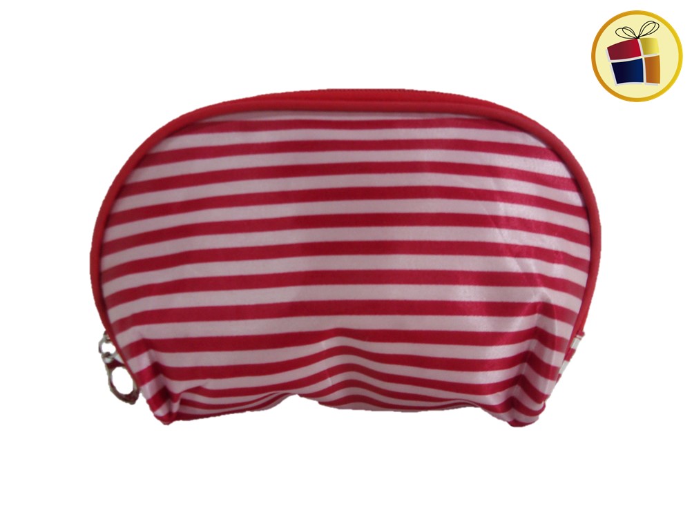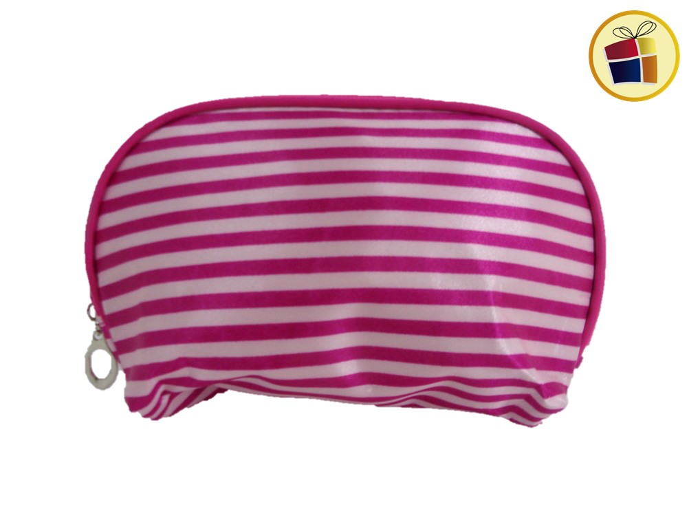 Porta cosmetico oval con tela rayado ideal para llevar maquillaje en bolsos o mochilas.