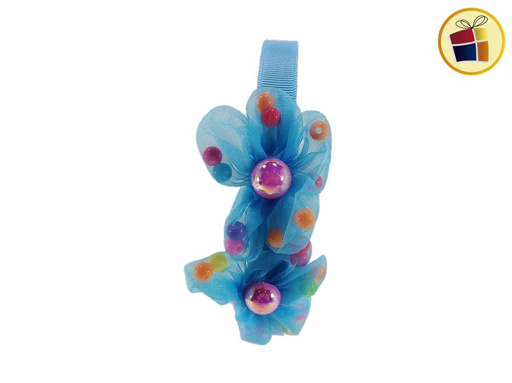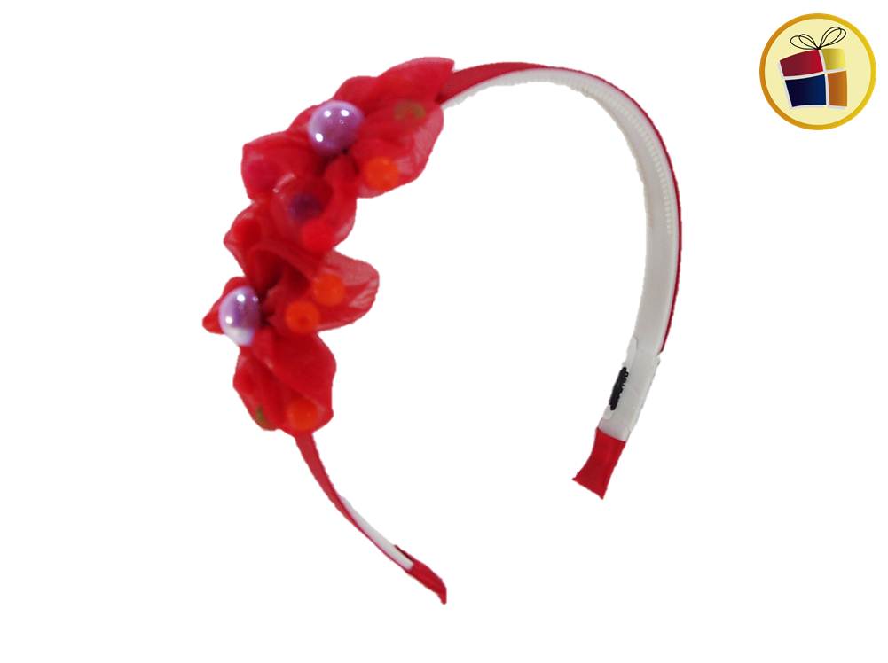 VINCHA FORRADA CON FLOR DE GASA Y PERLAS DE COLORES