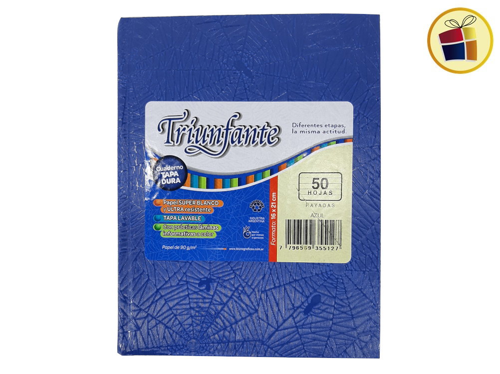 Cuaderno x50 hojas rayadas tapa carton araña, color: azul. Marca: triunfante