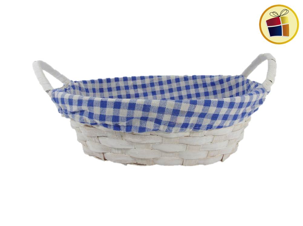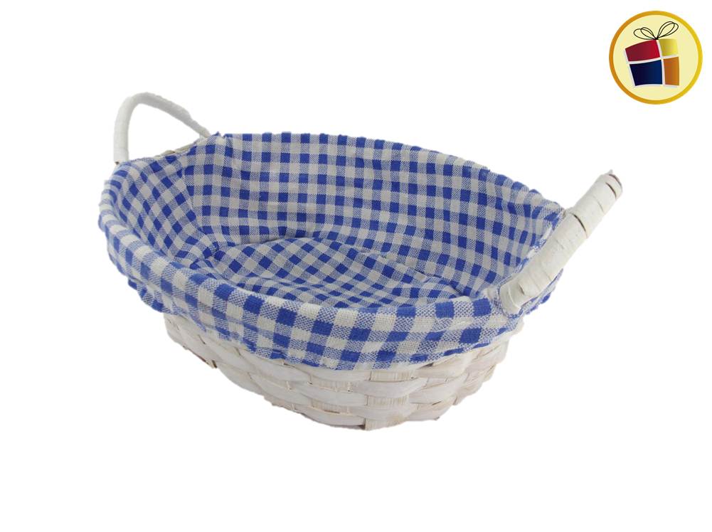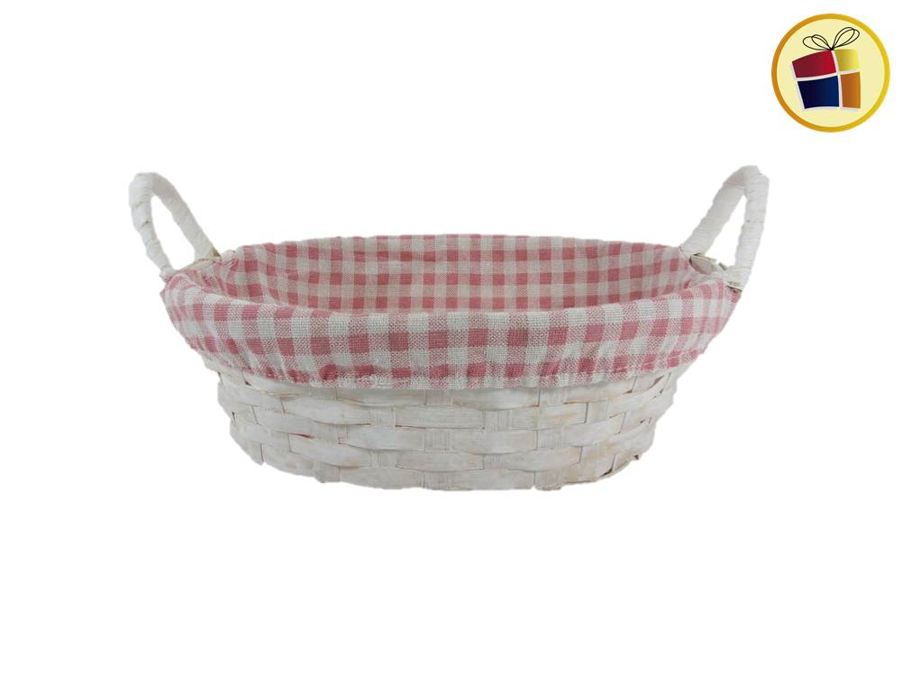 Panera de mimbre oval con tela a cuadrito de color y manijas.