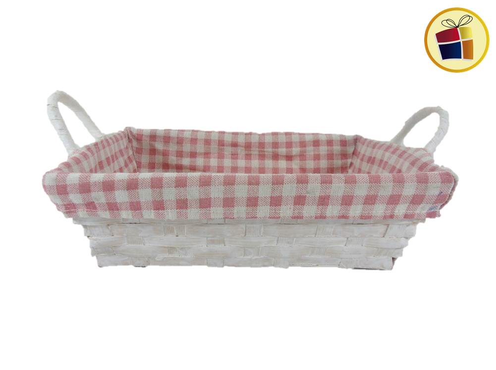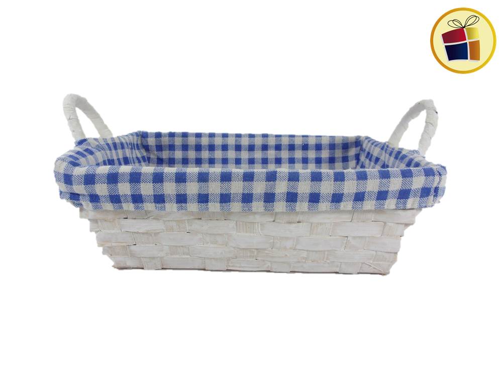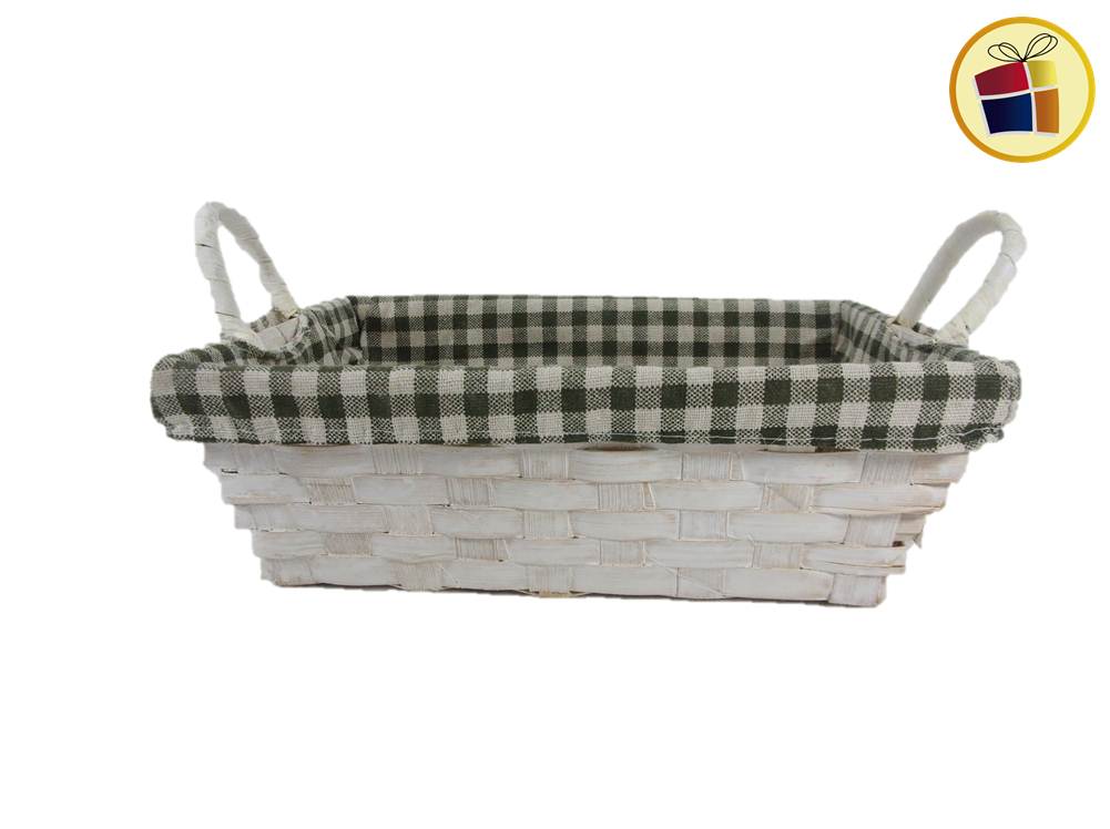 Panera de mimbre rectangular con tela a cuadrito de color y manijas.
