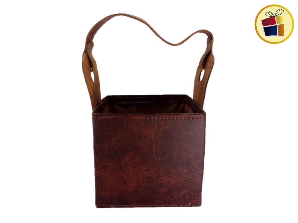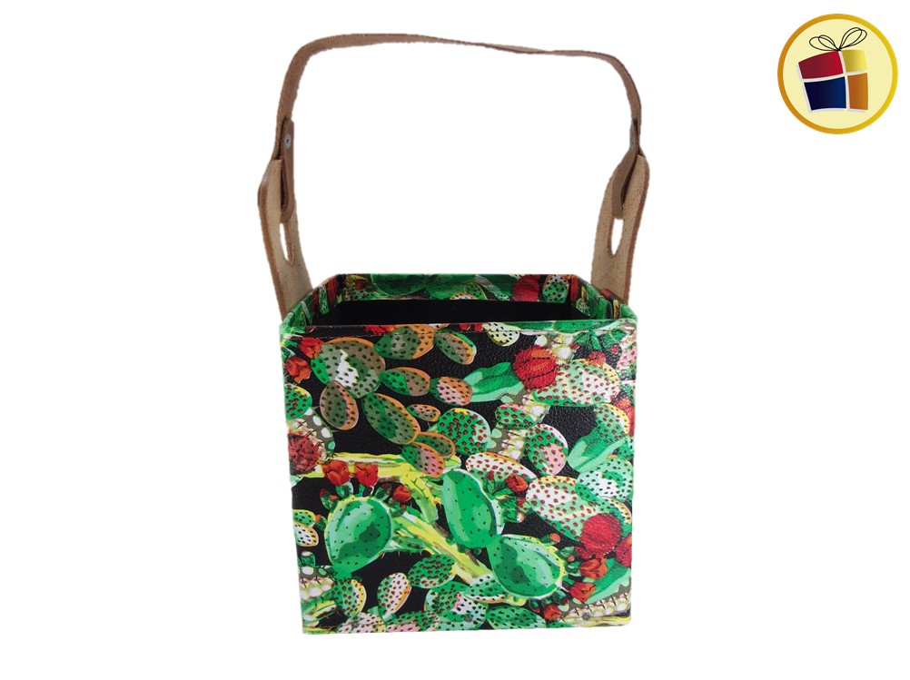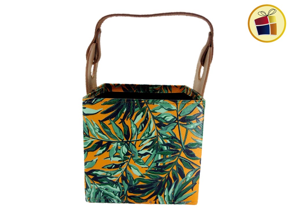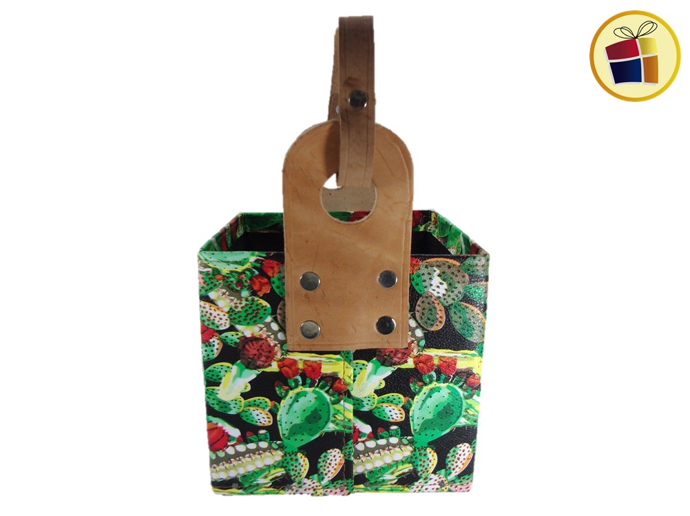 Porta termo canasto cajo con base de madera, manijas de cuero, en estampado y liso.