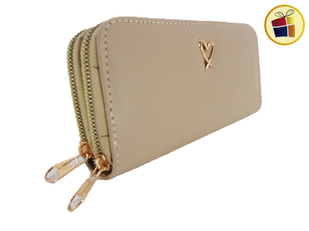 Con dos cierres, de cuerina, lisa con aplique de metal en forma de corazon dorado.