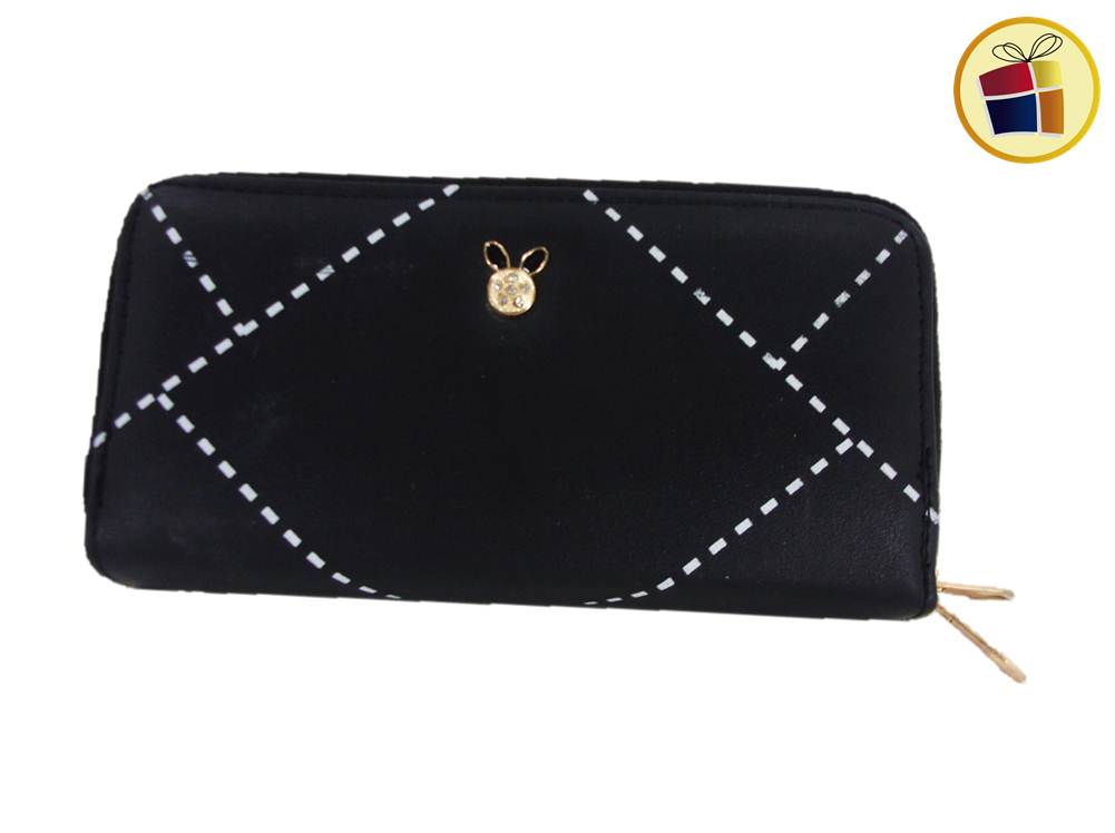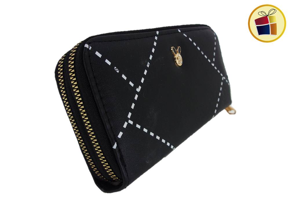 Con dos cierres, estampado lineas punteadas y con aplique metalico con strass, con divisiones para las tarjetas y bolsillo con cierre para monedas.