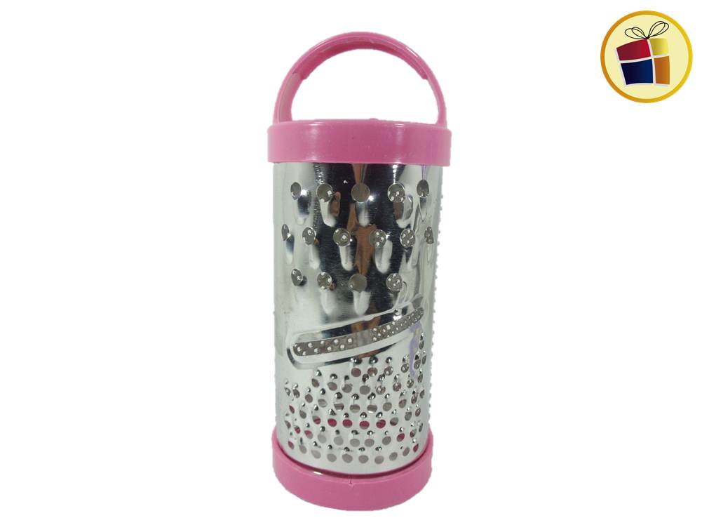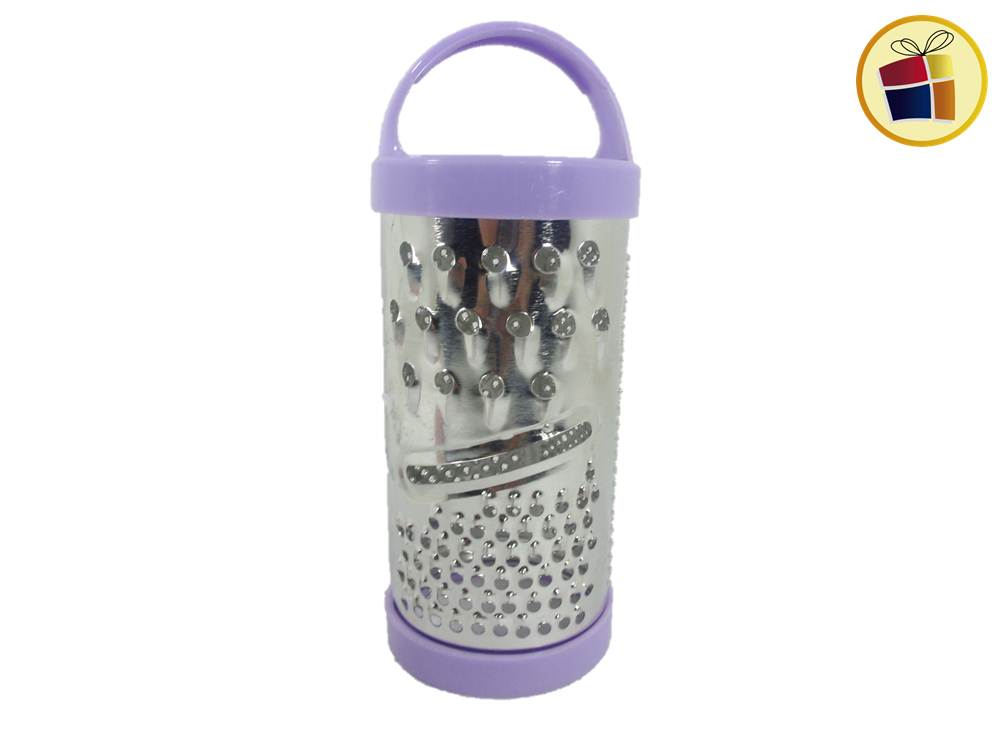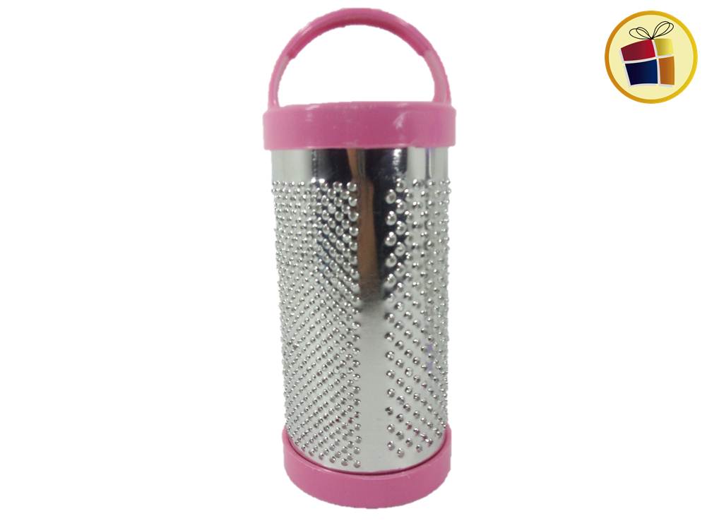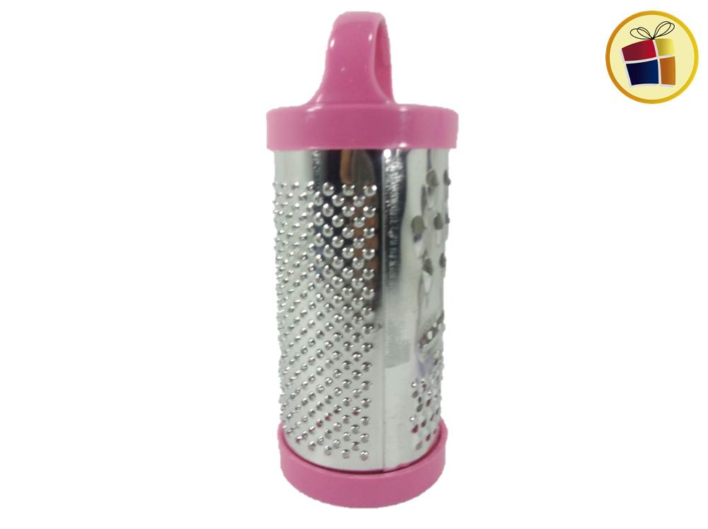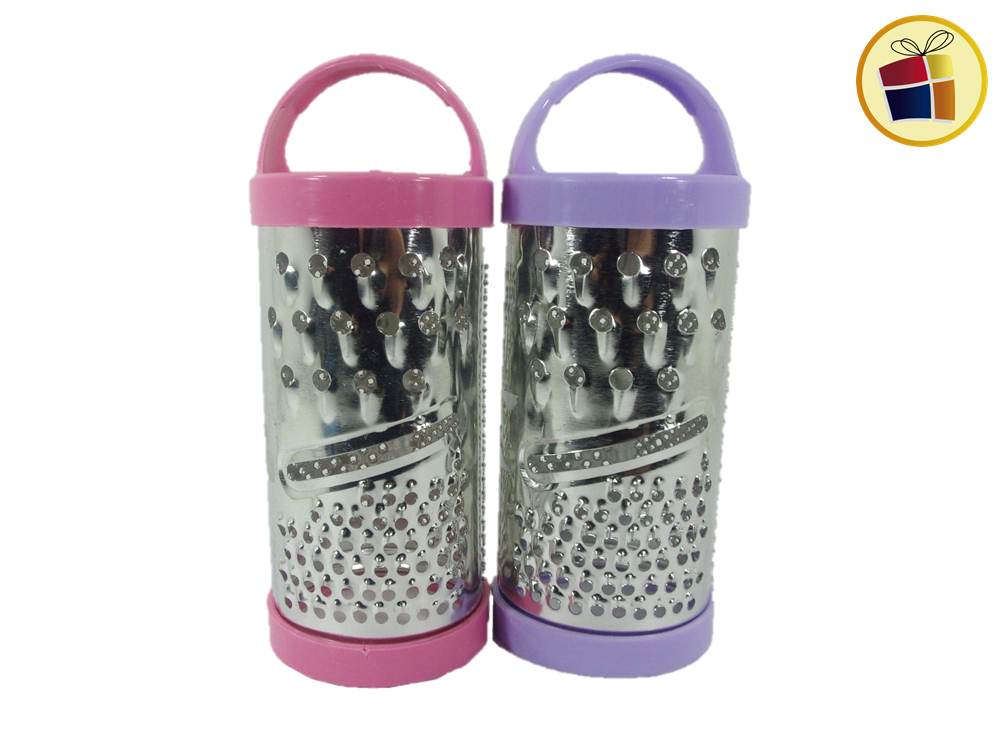 Rallador cilindrico hojalatada con base y manija de plastico de color.
