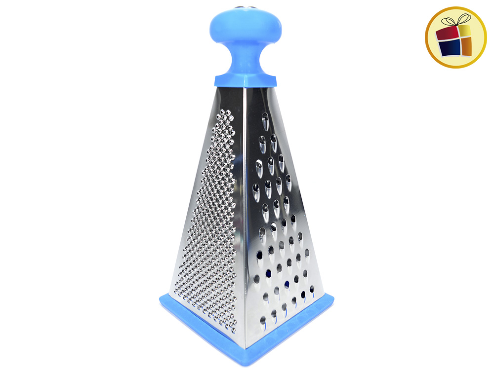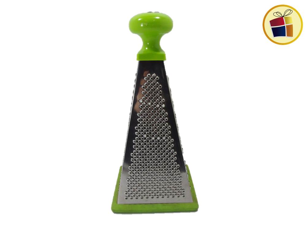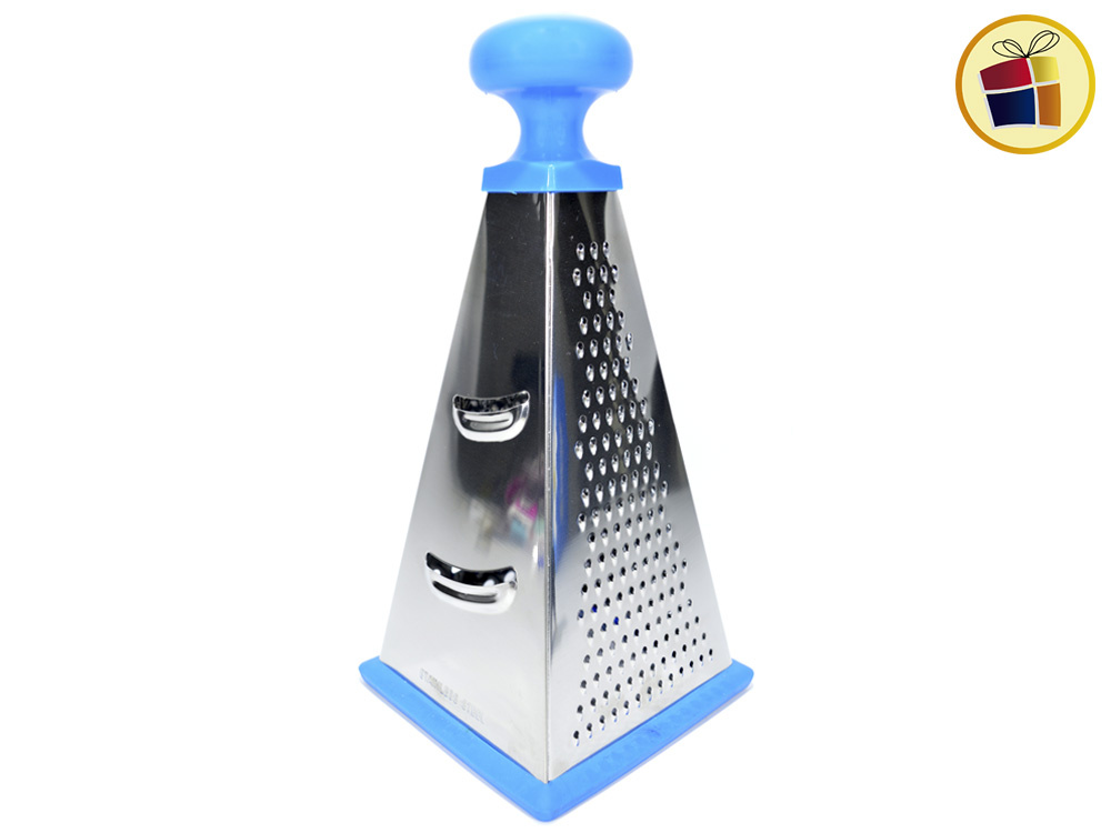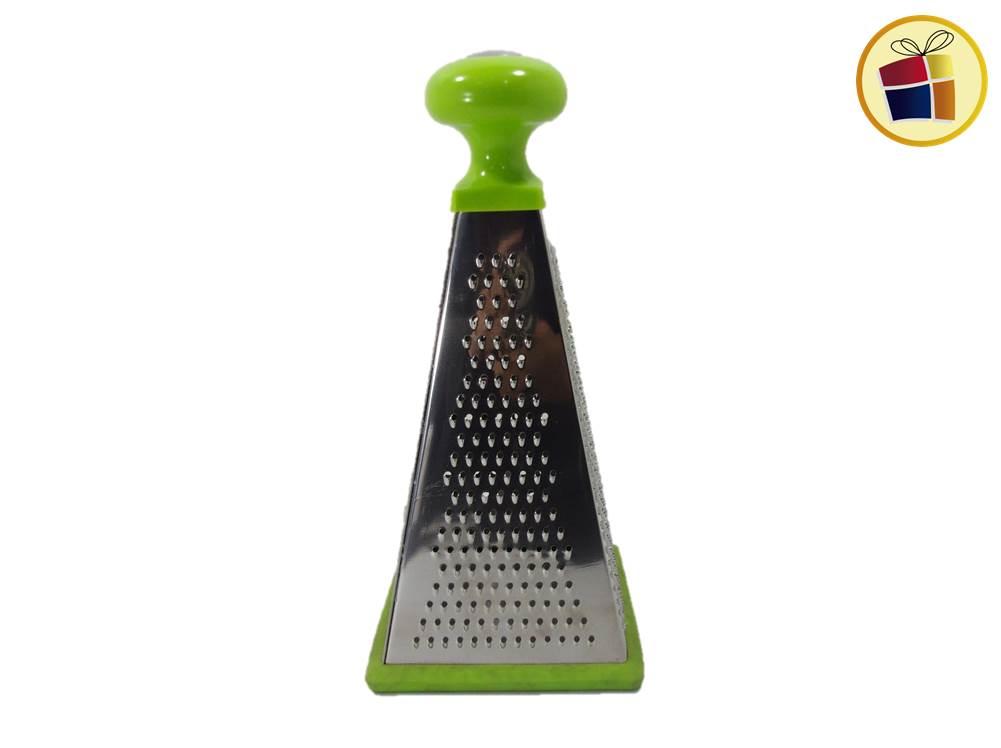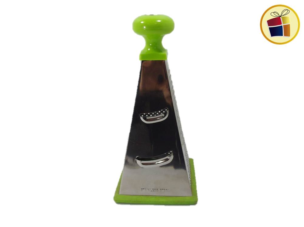 Rallador piramide de 4 caras, base de goma y mango de plastico de color.
