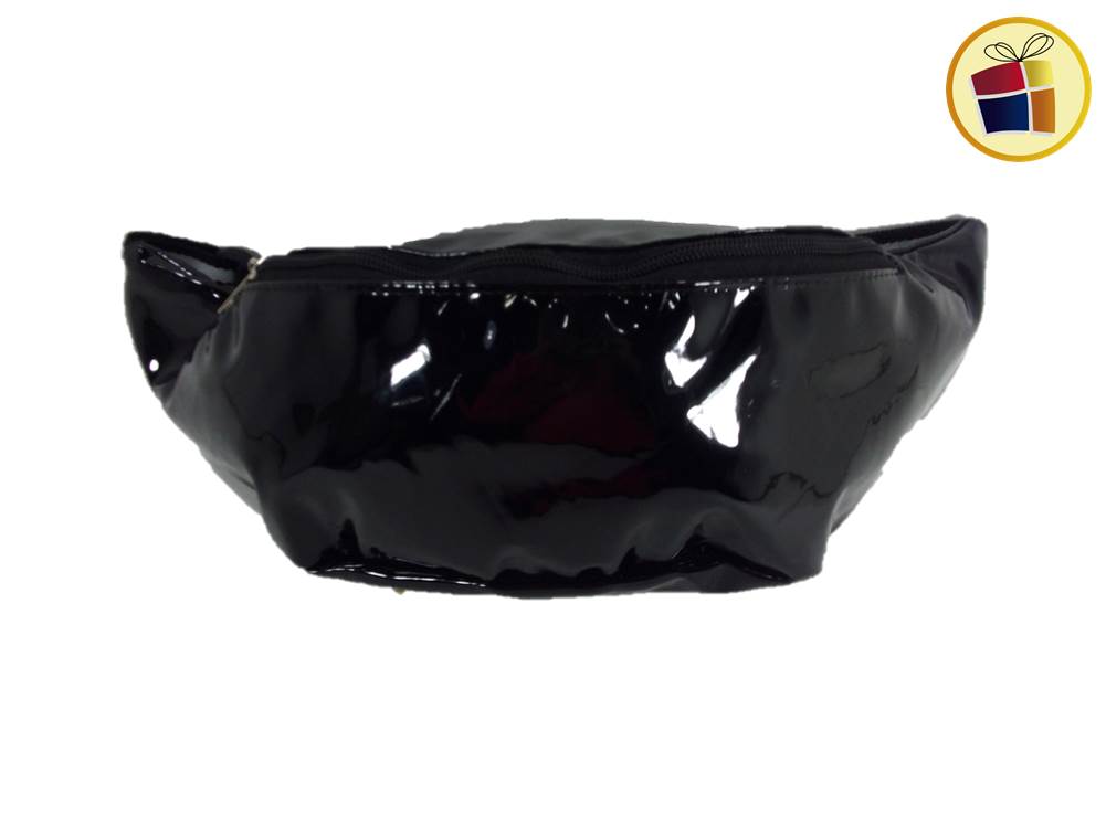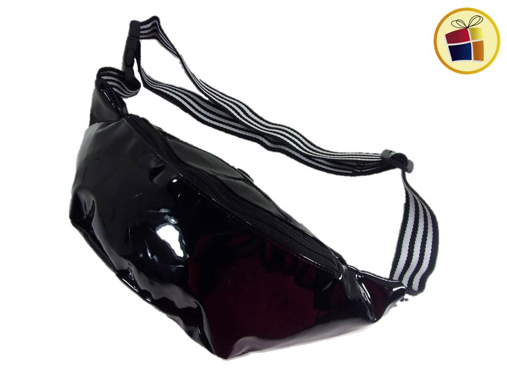 Riñonera Grande charol con cinta rayada con dos cierres.