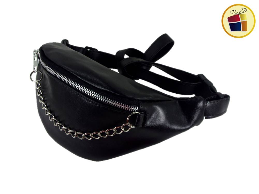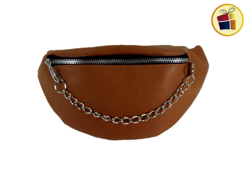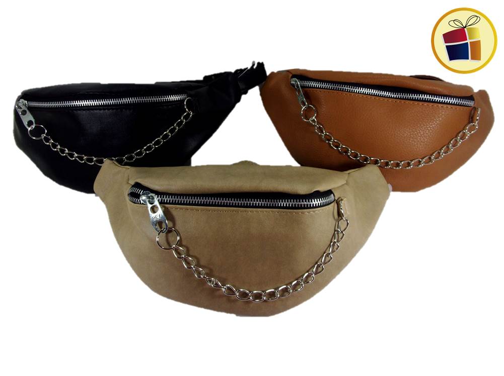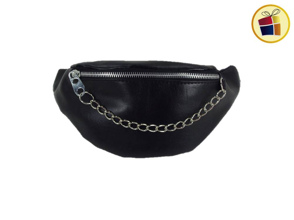 Riñonera de cuerina lisa con cadena grueza, con cierre.