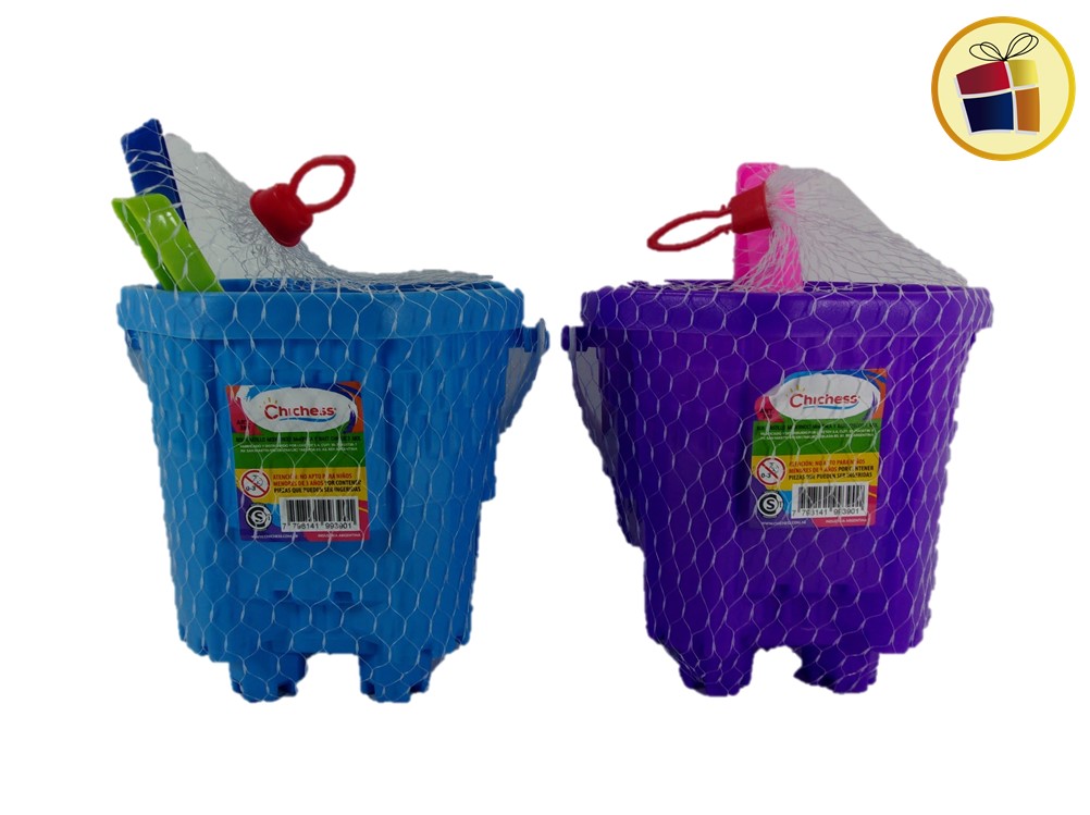 Set playa incluye balde + pala + rastrillo + moldes variado en colores