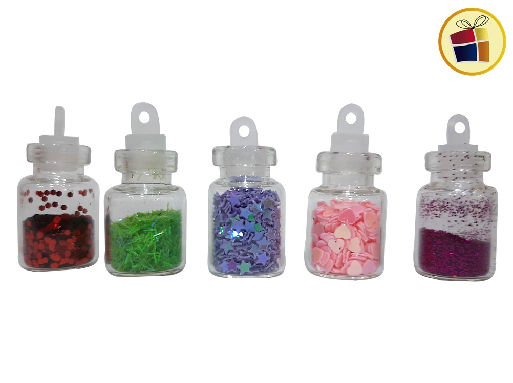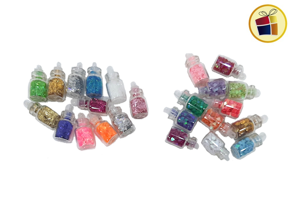 Incluye 12 frasquitos de vidrios, surtido en color y formas.