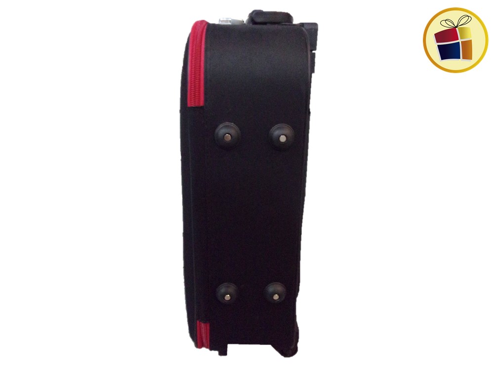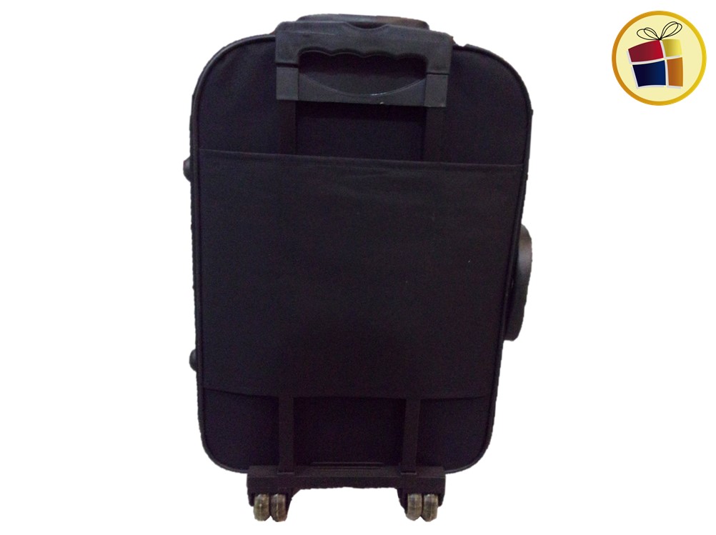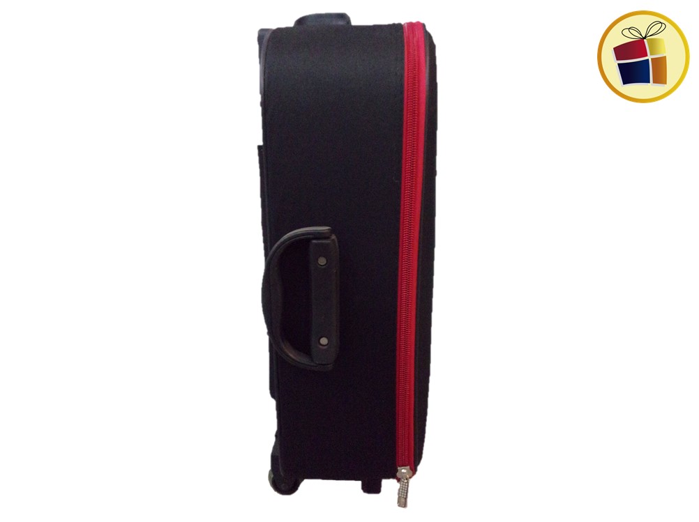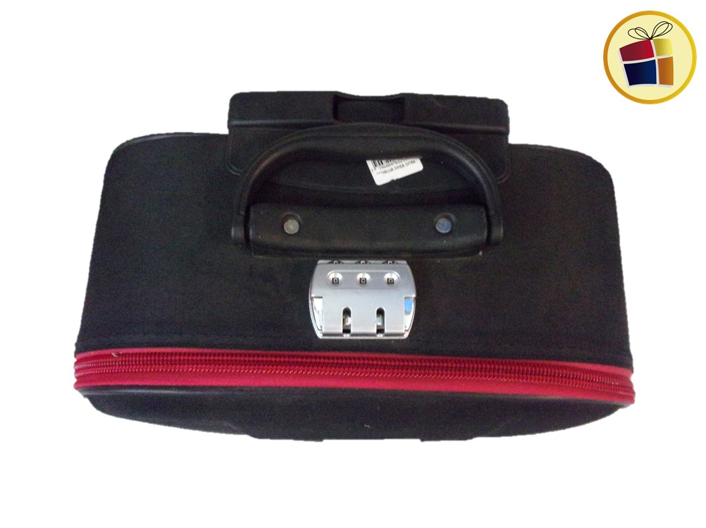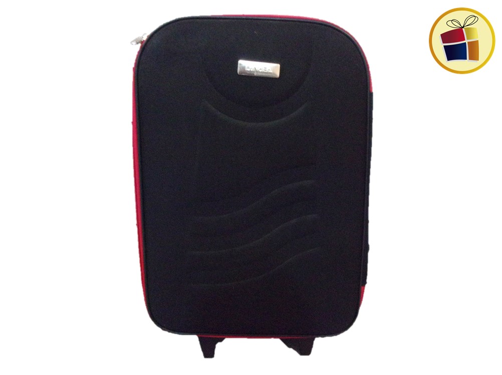 Valija lunden chica con traba, un cierre, dos manijas una al costado y la otra en la parte de arriba. Contiene dos rueditas con soporte, en la parte de adentro tiene elastico y un bolsillo red.