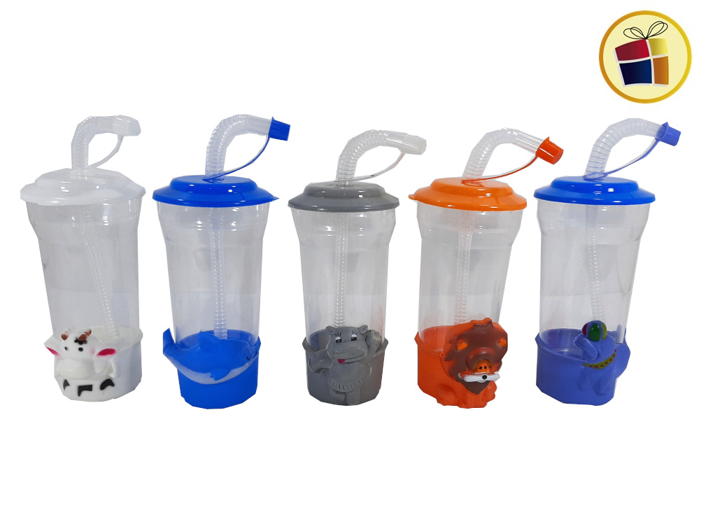 Con base en forma de animales surtido, con sorbete flexible, con tapa a presion.